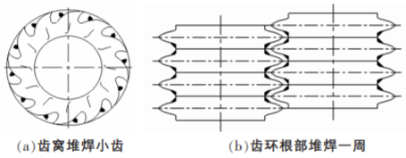 (3) 改進(jìn)破碎機(jī)的齒形,減小包容空間所謂包容空間是指兩破碎輥齒在旋轉(zhuǎn)中,齒面相互配合形成的封閉空間,一般來說,塊精煤的韌性較差,該空間可大一些,這樣可以增加物料的通過性。但是從破碎后的塊煤上很容易發(fā)現(xiàn)有破碎齒的劃痕,說明原煤中塊煤韌性好、不易破碎。針對以上情況,減小破碎機(jī)的包容空間,具體措施:在破碎機(jī)每個齒環(huán)根部一周采用耐磨合金焊條堆焊合金高約20mm,減小齒形的包容空間,同時在齒窩處堆焊直徑準(zhǔn)20mm、高20mm的小齒,減小齒窩的容納空間。包容空間處理措施如圖1所示。