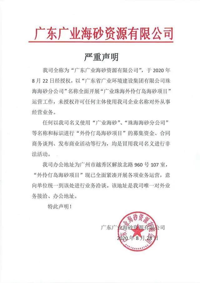 廣東廣業(yè)海砂資源有限公司此次聲明中表示,公司于2020年8月22日經(jīng)授權,以“廣東省廣業(yè)環(huán)境建設集團有限公司珠海海砂分公司”名稱全面開展“廣業(yè)珠海外伶仃島海砂項目”運營工作,未授權許可任何主體使用企業(yè)名稱對外從事經(jīng)營業(yè)務。任何以公司名義使用“廣業(yè)海砂”、“珠海海砂分公司”等名稱和標識進行“外伶仃島海砂項目”的募集資金、合同商務談判、發(fā)布商業(yè)活動等行為,均是冒用公司名義進行非法活動。公司辦公地址為廣州市越秀區(qū)解放北路960號107室,“外伶仃島海砂項目”現(xiàn)已全面緊湊開展各項業(yè)務運營,意向單位統(tǒng)一到該處進行業(yè)務洽談。該地址是公司唯一對外業(yè)務接洽、辦公地址。