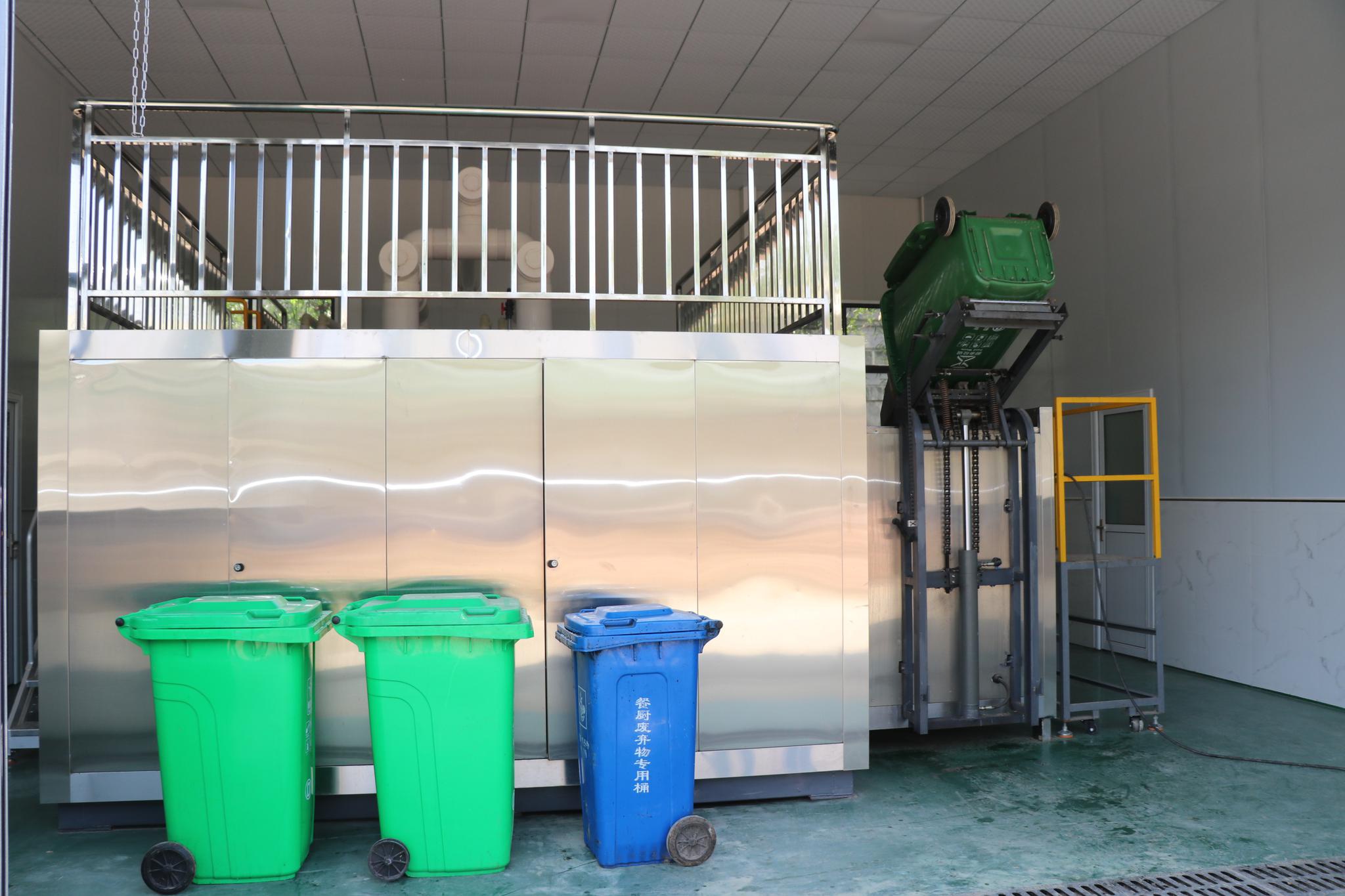 8日在武漢工商學(xué)院垃圾處理現(xiàn)場,操作員按下“有機垃圾生化處理一體”設(shè)備按鈕后,裝滿餐廚垃圾的專用桶緩緩上升至傳送帶,將垃圾傾瀉而出。預(yù)處理系統(tǒng)首先會對所有垃圾進行篩分,固體物料進入“好氧發(fā)酵系統(tǒng)”,再進行好氧發(fā)酵堆肥,產(chǎn)出有機肥;好氧發(fā)酵產(chǎn)生的廢氣經(jīng)噴淋塔生物除臭后達標排放;液體則進入“油水分離器”部分隔油后,分離的油脂可作為生物柴油原料,污水則經(jīng)生物反應(yīng)器處理后達標排放。