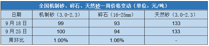 下周迎來國慶小長假,環(huán)保管控持續(xù)加大,限產(chǎn)、限載情況較多,砂石供應(yīng)或?qū)⒊跃o,下游需求大幅回升,短期部分市場或?qū)⒃俅纬霈F(xiàn)供不應(yīng)求現(xiàn)象,隨之砂石綜合價格持續(xù)偏強運行。截至09月25日,綜合砂石價格109元/噸,周環(huán)比上漲0.62%。全國機制砂均價100元/噸,周環(huán)比上漲1%;碎石均價94元/噸,周環(huán)比上漲1.06%;天然砂均價133元/噸,周環(huán)比持平。