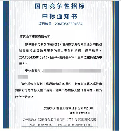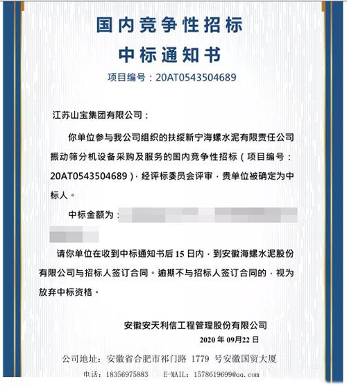 近日,江蘇山寶集團(tuán)在弋陽海螺、扶綏海螺600萬t/a骨料機(jī)制砂項(xiàng)目振動(dòng)篩分機(jī)設(shè)備(弋陽14臺(tái),扶綏12臺(tái))招標(biāo)中成功中標(biāo)。