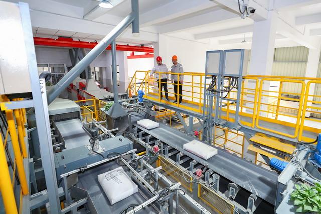 包裝車間采用了全自動(dòng)化的包裝線,從裝袋、運(yùn)輸?shù)窖b車碼堆全部自動(dòng)化完成。整個(gè)車間干凈整潔,一塵不染,完全改變了改造前塵土漫天的環(huán)境。原來需要10多個(gè)人才能完成的過程,現(xiàn)在只需要兩個(gè)工人添加包裝袋即可。