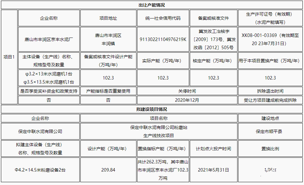 方案顯示,保定中聯(lián)水泥有限公司受讓262.3萬(wàn)噸產(chǎn)能,其中包括唐山金順達(dá)水泥有限公司40萬(wàn)噸(唐山市玉田縣),唐山市豐潤(rùn)區(qū)京豐水泥廠102.3萬(wàn)噸(唐山市豐潤(rùn)區(qū)),新建設(shè)計(jì)年產(chǎn)能209.84萬(wàn)噸水泥粉磨生產(chǎn)線2條,置換比例1.25:1,項(xiàng)目建設(shè)地點(diǎn)為保定市順平縣,2021年5月31日計(jì)劃點(diǎn)火投產(chǎn)。