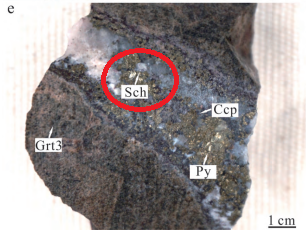 付家山鎢礦床手標(biāo)本 紅圈中為白鎢礦
