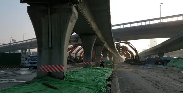 與此同時,金寨路高架南向東右轉(zhuǎn)匝道(E匝道)也已封閉,將于明日(2月14日)進行改造。據(jù)悉,金寨路高架南向東右轉(zhuǎn)匝道改造部分共五孔,長度105米,橋梁凈空4~9米。由于受到空間限制,計劃配置10臺破碎機、5臺霧炮車、2臺液壓鉗進行施工,施工時間也控制在每日8:00~20:00,預(yù)計7天完成。