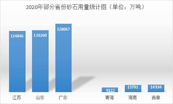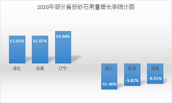 2020年,砂石用量增長(zhǎng)幅度前三位的省份分別為遼寧省、河南省及河北省,增幅分別是14.06%、12.07%及12.05%。而需求量降幅最大的三個(gè)省份則分別為湖北省、青海省、海南省,降幅分別是11.40%、9.82%及8.92%。值得一提的是在砂石整體用量并不高的東三省,其用量的增長(zhǎng)幅度卻排名靠前(遼寧、吉林、黑龍江分列1、6、7位),或許為并不活躍的東北砂石市場(chǎng),帶來了一絲希望曙光。然而,青海省、海南省卻出現(xiàn)用量與用量增幅雙低的情況,雖然可能由于青海省人口較少,海南省地域面積(除海域)較為狹小,會(huì)造成一定幅度砂石用量的減少,但降幅之大,也足夠引起當(dāng)?shù)厣笆袠I(yè)上下游企業(yè)及相關(guān)部門的警惕。