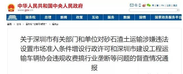 關(guān)于深圳市有關(guān)部門和單位對(duì)砂石渣土運(yùn)輸涉嫌違法設(shè)置市場(chǎng)準(zhǔn)入條件增設(shè)行政許可和深圳市建設(shè)工程運(yùn)輸車輛協(xié)會(huì)違規(guī)收費(fèi)搞行業(yè)壟斷等問(wèn)題的督查情況通報(bào)