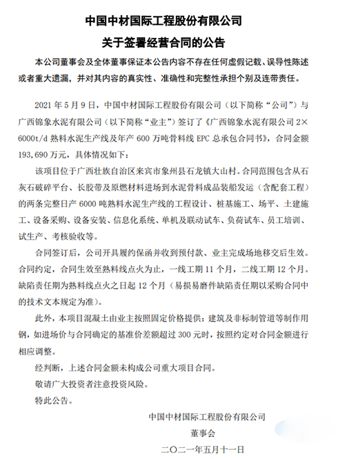2021 年5月9日,中國中材國際工程股份有限公司(以下簡稱“公司”)與廣西錦象水泥有限公司(以下簡稱“業(yè)主”)簽訂了《廣西錦象水泥有限公司 2×6000t/d 熟料水泥生產(chǎn)線及年產(chǎn) 600 萬噸骨料線 EPC 總承包合同書》,合同金額193690 萬元。