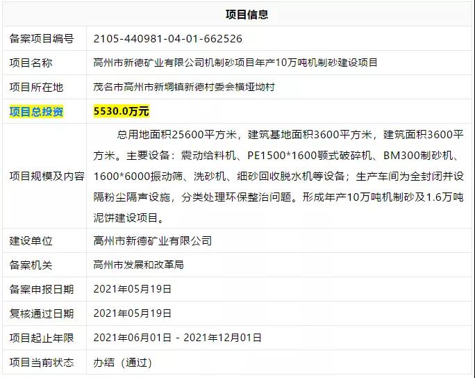 投資5530萬元,廣東茂名即將新建機制砂項目!