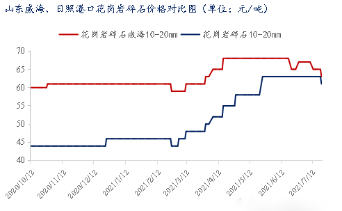 據(jù)統(tǒng)計,截至7月21日,日照港花崗巖碎石平倉價在57-59元/噸。目前山東地區(qū)威海、日照港口碎石有通過船運到長三角市場,2021年春節(jié)后,3-5月份兩地港口平倉價格持續(xù)上漲,一方面因本礦山開采受限,另一方面受金礦事故影響,多個砂石礦山停產(chǎn),因此碎石供應(yīng)量遲遲不能回升,外銷平倉價格攀爬上行,累計漲幅在15元/噸。隨著二季度到來,南方市場多地進入梅雨季節(jié),建筑市場需求低迷,威海、日照港口平倉價格小幅回落3-5元/噸。