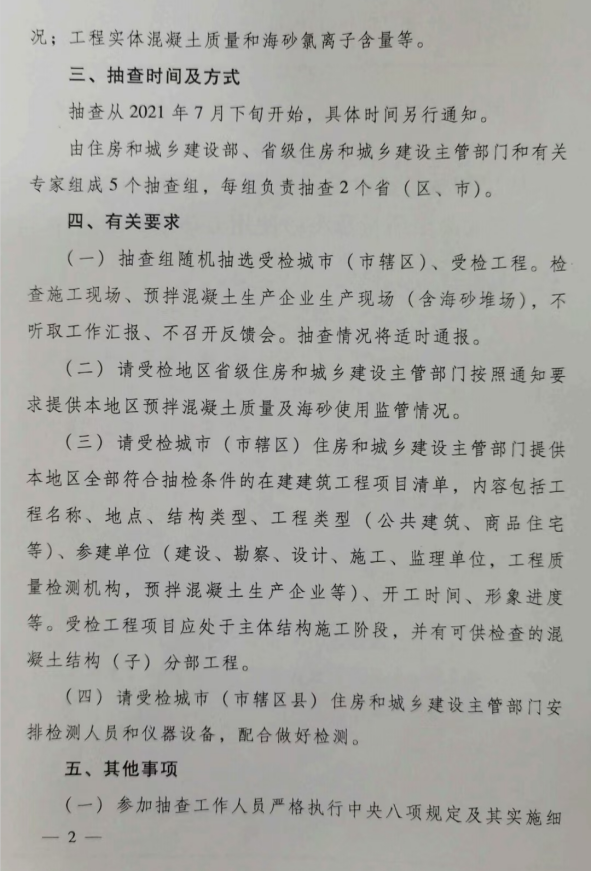 (二)請(qǐng)受檢地區(qū)省級(jí)住房和城鄉(xiāng)建設(shè)主管部門按照通知要求提供本地區(qū)預(yù)拌混凝土質(zhì)量及海砂使用監(jiān)管情況。