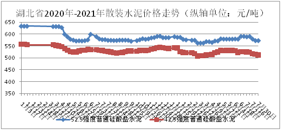 普通硅酸鹽水泥,湖北省平均價格分別為:518.55元/噸、541.95元/噸、581.49元/噸,與6月相比,價格分別下跌1.46%、0.85%和0.59%;同比變化情況為-2.25%、0.32%、0.23%。具體價格走勢情況如下圖: