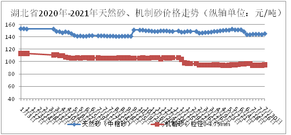 近日,湖北發(fā)改委發(fā)布7月全省建筑用砂石水泥混凝土行情通報,其中天然砂(中粗砂)的均價為144.44元/噸,中粗砂的均價為144.94元/噸;機(jī)制砂(粒徑0-4.75mm)的均價為94.28元/噸;碎石(粒徑5-16mm)的均價為80.80元/噸,碎石(粒徑17-31.5mm)的均價為88.78元/噸。