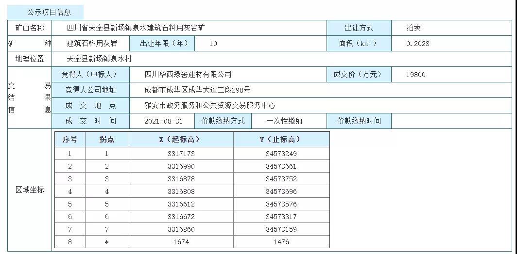 根據(jù)國土資源部關于印發(fā)《礦業(yè)權交易規(guī)則》的通知(國土資規(guī) [2017] 7號)有關規(guī)定,2021年8月31日,在雅安市政務服務和公共資源交易服務中心舉辦的四川省天全縣新場鎮(zhèn)泉水建筑石料用灰?guī)r礦采礦權拍賣出讓活動,成交結果如下: