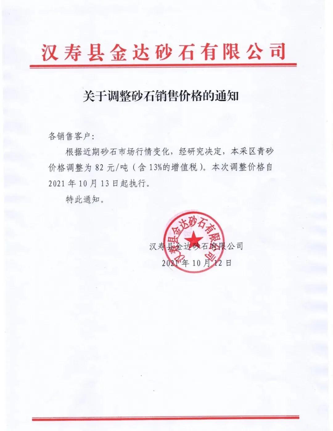 近日,漢壽縣金達砂石有限公司發(fā)布調(diào)價通知,青砂價格調(diào)整為82元/噸,較之前上漲3元/噸,自2021年10月13日開始執(zhí)行。   ..
