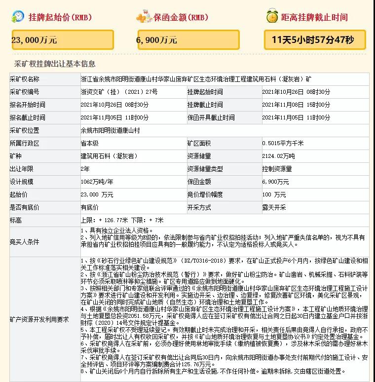 據(jù)了解,該礦區(qū)位于浙江省余姚市陽明街道康山村,開采礦種為建筑用石料(凝灰?guī)r),礦區(qū)面積約0.5015平方千米。采礦權(quán)出讓期限自采礦許可證頒發(fā)之日起2年,起始價23000萬元,生產(chǎn)規(guī)模1062萬噸/年。