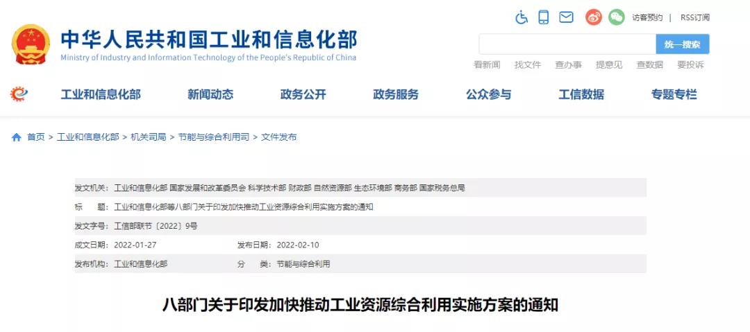 近日,工業(yè)和信息化部、國家發(fā)展和改革委員會、科學技術(shù)部、財政部、自然資源部、生態(tài)環(huán)境部、商務部、國家稅務總局等八部門聯(lián)合印發(fā)《關(guān)于加快推動工業(yè)資源綜合利用的實施方案》(以下簡稱《實施方案》)。