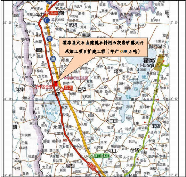 安徽省霍邱六興礦業(yè)有限公司霍邱縣火石山建筑石料用石灰?guī)r礦露天開采加工項目擴建工程(年產(chǎn)600萬噸)位于安徽省六安市霍邱縣馮井鎮(zhèn)境內(nèi),105國道西側(cè),距105國道396米,沿國道向北20.4千米達淮河,向南70千米與312國道,寧西鐵路相連,可至六安、合肥、南京等地,最近的火車站為霍邱站,淮河有小輪船,順流而下至鳳臺、淮南、蚌埠,交通便利。工程建設規(guī)模為開采原礦600萬噸/年,主要建設內(nèi)容包括露天采場、開拓運輸?shù)缆贰⒌V石加工場地、辦公生活場地等。