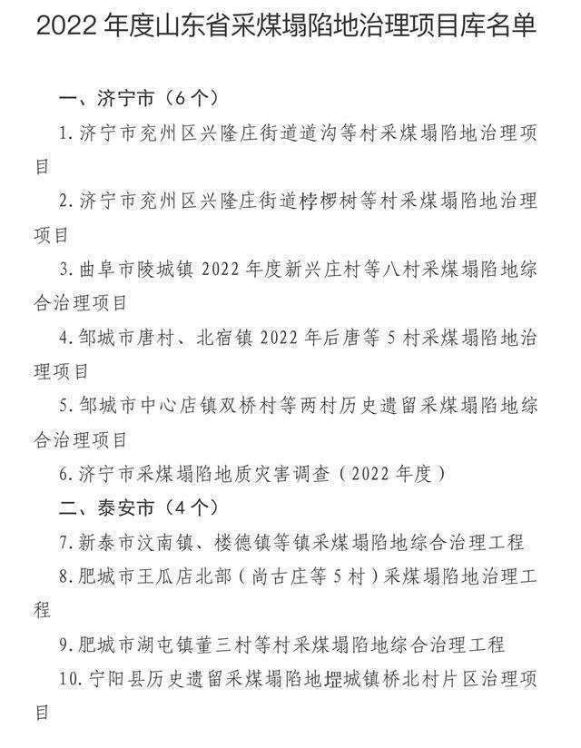 山東省能源局近日發(fā)布了“2022年度山東省采煤塌陷地治理項目庫入庫項目名單的公告”。根據(jù)《關(guān)于進(jìn)一步加強(qiáng)省級采煤塌陷地綜合治理專項資金與項目管理的通知》(魯財建〔2021〕28號)要求,省能源局組織開展了2022年度省采煤塌陷地綜合治理專項資金支持項目申報工作。經(jīng)各市自主申報、資格初審、專家評審、網(wǎng)上公示等程序,確定將濟(jì)寧市兗州區(qū)興隆莊街道道溝等村采煤塌陷地治理項目等10個項目列入2022年度山東省采煤塌陷地治理項目庫,現(xiàn)予公告: