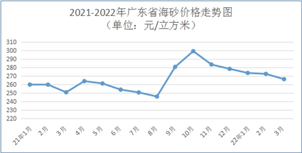 (一)河砂和海砂價格持續(xù)小幅下跌,但海砂價格仍高于去年同期。據(jù)監(jiān)測,3月份全省河砂平均購進(jìn)價為每立方米213元,環(huán)比(與2月份比,下同)下跌2.09%,同比(與2021年3月份比,下同)下降1.68%。其中,中砂(0.35-0.5mm)平均購進(jìn)價為每立方米224元,環(huán)比下跌4.02%,同比下跌1.84%;粗砂(大于0.5mm)平均購進(jìn)價為每立方米203元,環(huán)比微漲0.13%,同比下降1.52%。珠三角地區(qū)海砂(淡化處理)平均購進(jìn)價為每立方米266元,環(huán)比下跌2.29%,同比上漲6.15%。
