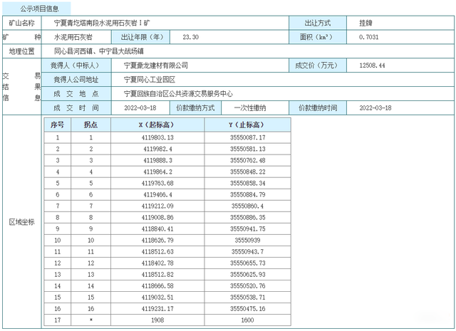 近日,自然資源部發(fā)布了關(guān)于寧夏青圪塔南段水泥用石灰?guī)rⅠ礦采礦權(quán)掛牌出讓結(jié)果公示。從公示中得知寧夏豪龍建材以1.25億元競(jìng)得了該礦山采礦權(quán)。