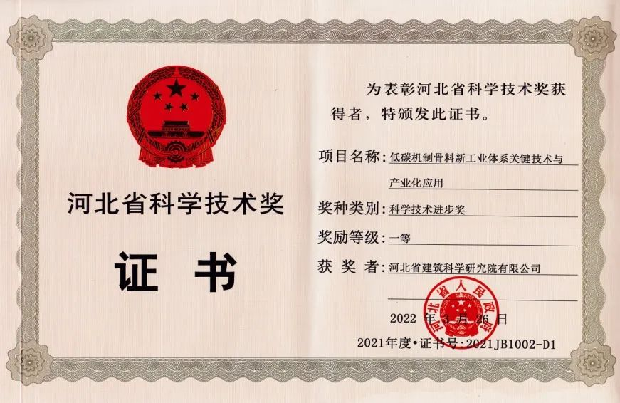 在4月12日上午召開的河北省科學(xué)技術(shù)獎勵大會上,河北省建研院科研項目“低碳機制骨料新工業(yè)體系關(guān)鍵技術(shù)與產(chǎn)業(yè)化應(yīng)用”榮獲河北省科技進(jìn)步一等獎。多年來,河北省建研院堅持科技興企發(fā)展理念,積極開展行業(yè)關(guān)鍵、共性技術(shù)研發(fā)與推廣應(yīng)用,取得了連續(xù)17年榮獲河北省科技進(jìn)步獎的驕人成績;其中,2019年、2020年、2021年連續(xù)三年獲河北省科技進(jìn)步一等獎。