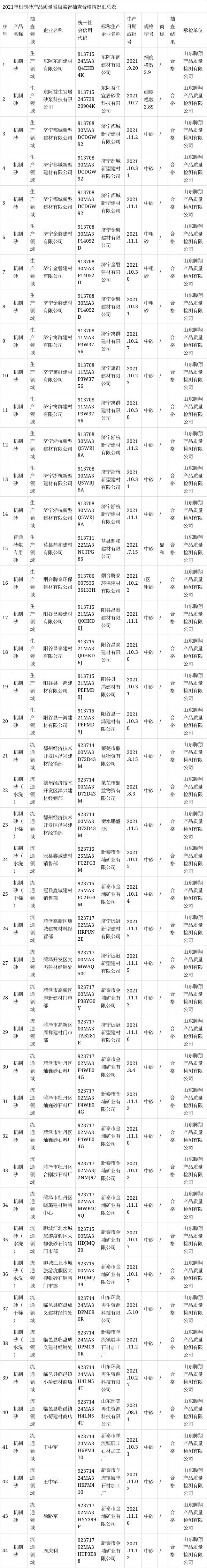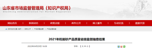 2022年4月29日,山東省市場監(jiān)督管理局網(wǎng)站公布2021年機制砂產(chǎn)品質(zhì)量省級監(jiān)督抽查結(jié)果。信息顯示,2021年第4批省級監(jiān)督抽查共抽查機制砂產(chǎn)品44批次,其中,生產(chǎn)領域20批次,流通領域24批次。抽查未發(fā)現(xiàn)不合格項目。