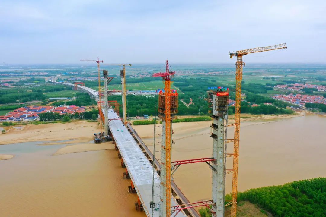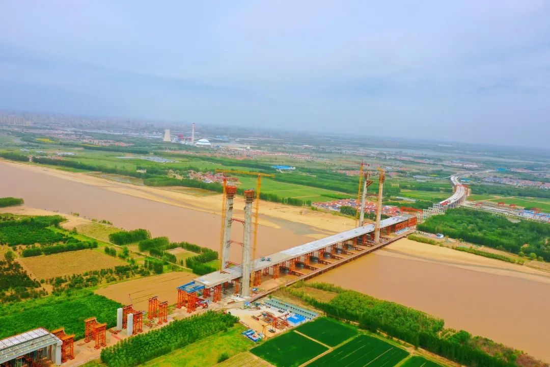黃河特大橋為項目重點控制性工程,由中交一公局集團(tuán)承建,全長4630米,其中主橋全長962米,主跨442米,是黃河下游最大跨徑的橋梁,主橋采用雙塔雙索面鋼混組合梁(UHPC橋面板)頂推施工,重量超27000噸,開創(chuàng)黃河下游組合梁斜拉橋頂推施工之最,并且是全國首次大規(guī)模采用無粗骨料UHPC超高性能混凝土的工程。該橋共設(shè)4個主塔,塔高154米,相當(dāng)于51層樓高,塔身采用液壓爬模系統(tǒng)施工,施工安全要求極高。