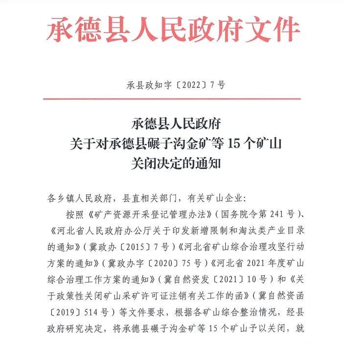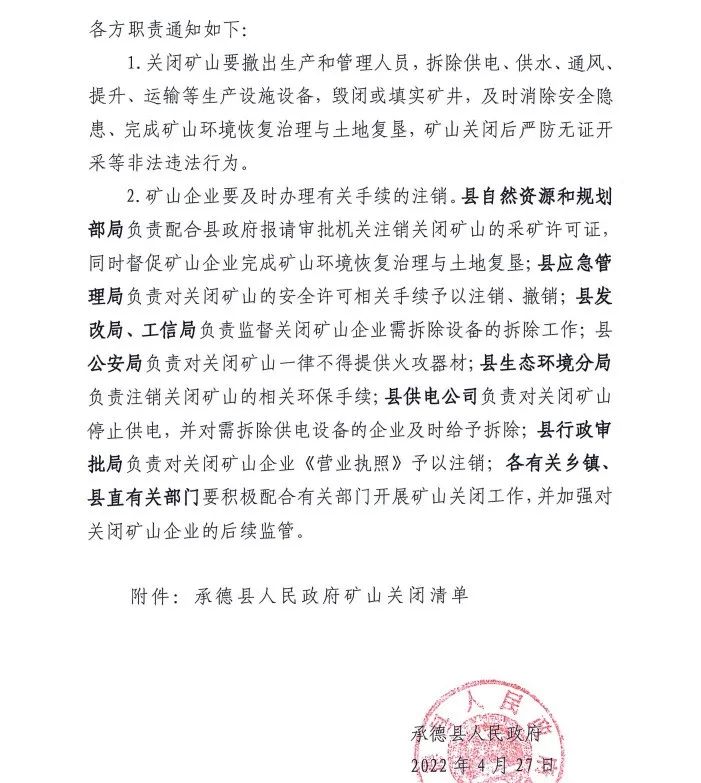 近日,按照多項有關(guān)文件要求,結(jié)合礦山綜合整治情況,河北承德縣政府研究決定,將關(guān)閉縣內(nèi)15座礦山,并于4月27日發(fā)步關(guān)閉通知。