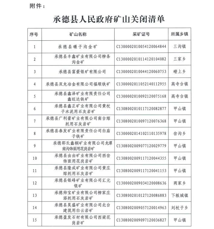 河北承德決定關(guān)閉砂石等15家礦山?。▋?nèi)附名單)
