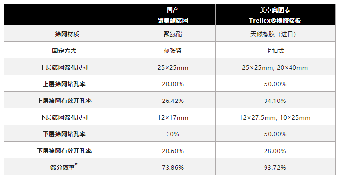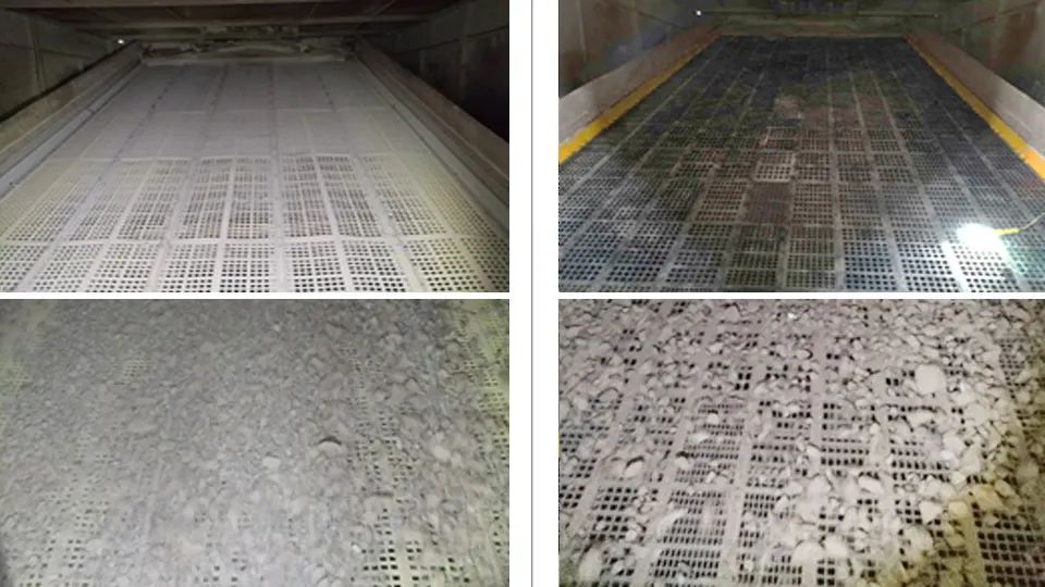 國產聚氨酯篩網(左)與美卓奧圖泰Trellex橡膠篩板(右)現場應用對比