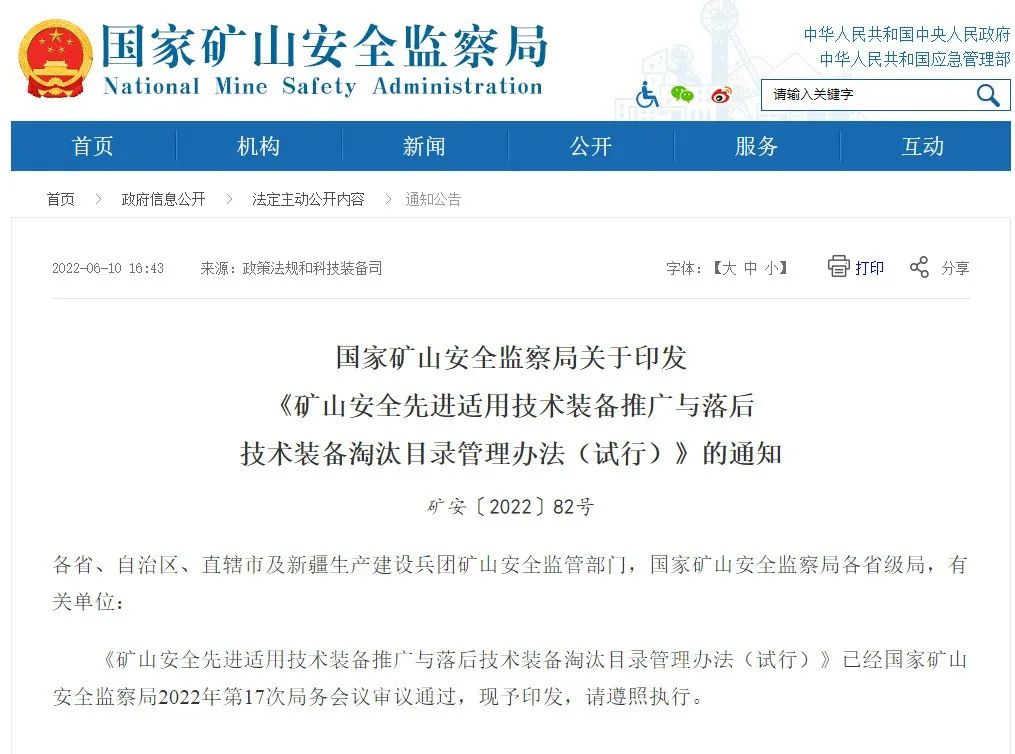 《礦山安全先進(jìn)適用技術(shù)裝備推廣與落后技術(shù)裝備淘汰目錄管理辦法(試行)》已經(jīng)國(guó)家礦山安全監(jiān)察局2022年第17次局務(wù)會(huì)議審議通過,現(xiàn)予印發(fā),請(qǐng)遵照?qǐng)?zhí)行。