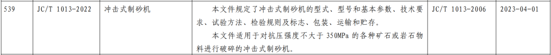 近日,工業(yè)和信息化部發(fā)布公告(2022年第23號),批準發(fā)布了1036項行業(yè)標準和29項行業(yè)標準外文版。歸口建材領域的行業(yè)標準共111項,其中,砂石行業(yè)《中國ISO標準砂粒度檢測方法》、《沖擊式制砂機》兩項標準批準發(fā)布。