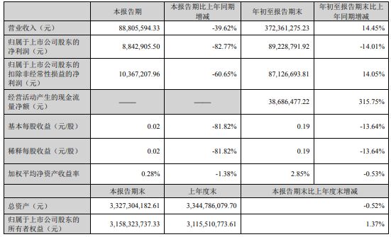 歸屬于上市公司股東的凈利潤為89,228,791.92元,比上年同期下滑14.01%,主要系:①上年同期轉(zhuǎn)讓湖南發(fā)展春華健康投資有限公司(以下簡稱“湖南發(fā)展春華”)12%股權(quán)所致;②本季度砂石業(yè)務(wù)和發(fā)電量較上年同期減少,利潤相應(yīng)減少所致;③確認的參股公司投資收益較上年同期減少所致。