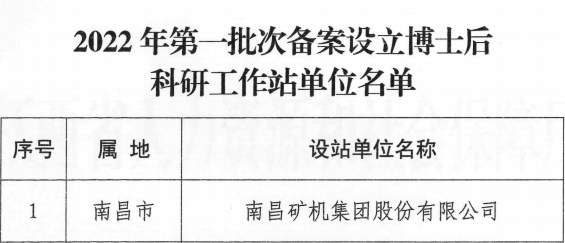 近日,從江西省人力資源和社會保障廳獲悉,全國博士后管理委員會辦公室印發(fā)《關(guān)于2022年第一批次博士后科研工作站新設(shè)站備案情況的函》,南昌礦機集團股份有限公司(下稱“南昌礦機”)榮列其中,獲批設(shè)立博士后科研工作站,系南昌市此次唯一一家入選企業(yè)。這也是南昌礦機在科研平臺建設(shè)和高層次人才培養(yǎng)方面取得的又一重要成果。