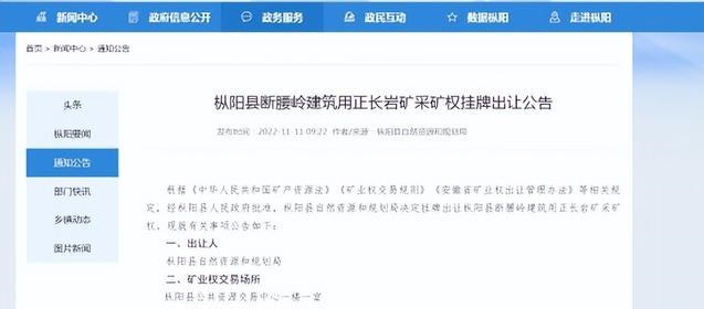 11月11日,樅陽縣自然資源和規(guī)劃局掛牌出讓了樅陽縣斷腰嶺建筑用正長巖礦采礦權(quán)。礦區(qū)儲量有2215.03萬噸。