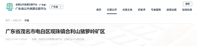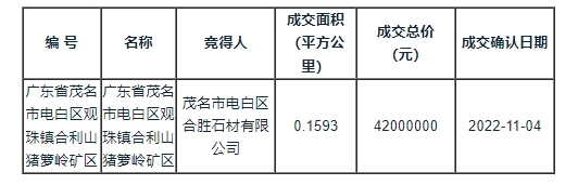 2、茂名市電白區(qū)觀珠鎮(zhèn)合利山豬籮嶺礦:競得人茂名市電白區(qū)合勝石材有限公司,成交價:2400萬。出讓資源儲量:保有礦石儲量約534萬m。礦山設計生產(chǎn)規(guī)模:30萬m/年。采礦權出讓期限:12年。