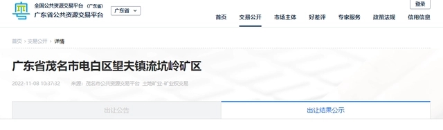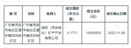 3、茂名市電白區(qū)望夫鎮(zhèn)流坑嶺礦區(qū):競得人城投(茂名電白)礦產(chǎn)開發(fā)有限公司,成交價:1500萬。出讓資源儲量:保有礦石儲量約450萬m。礦山設計生產(chǎn)規(guī)模:30萬m/年。采礦權出讓期限:5.4年。