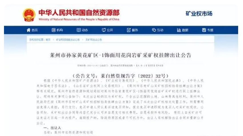 山東萊州花崗巖礦山起拍4200萬(wàn)元,掛牌出讓10年