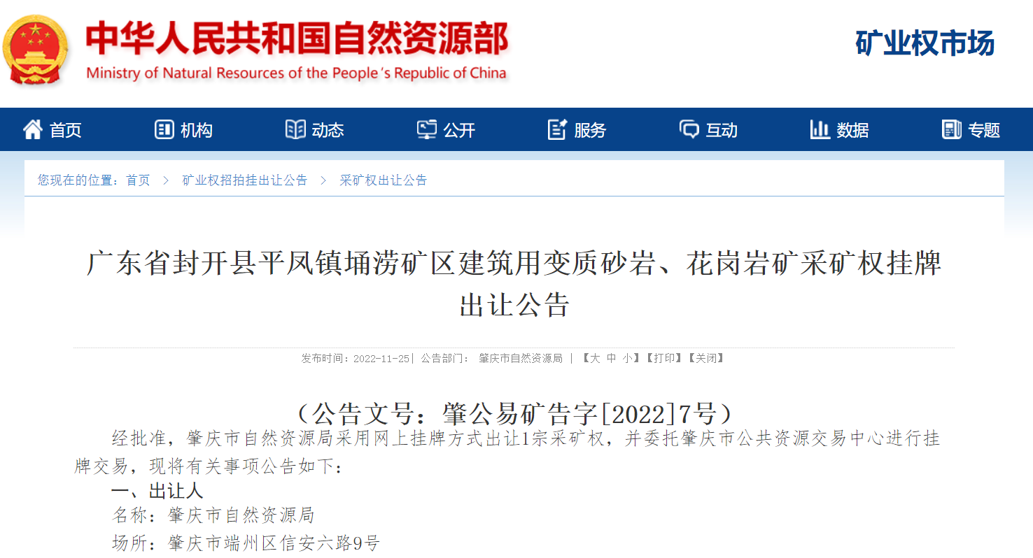 近日,經(jīng)政府批準(zhǔn),肇慶市自然資源局委托肇慶市公共資源交易中心進行掛牌出讓廣東省封開縣平鳳鎮(zhèn)埇澇礦區(qū)建筑用變質(zhì)砂巖、花崗巖礦采礦權(quán)。