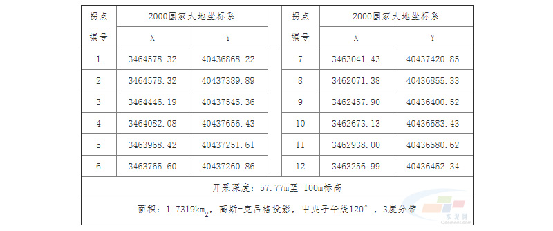 擬出讓采礦權(quán)開采標(biāo)高+57.77m至-100.0m,礦區(qū)面積1.7319平方千米,礦區(qū)范圍由12個坐標(biāo)圈定如下:
