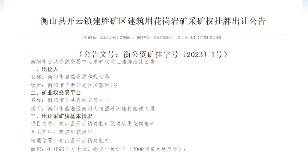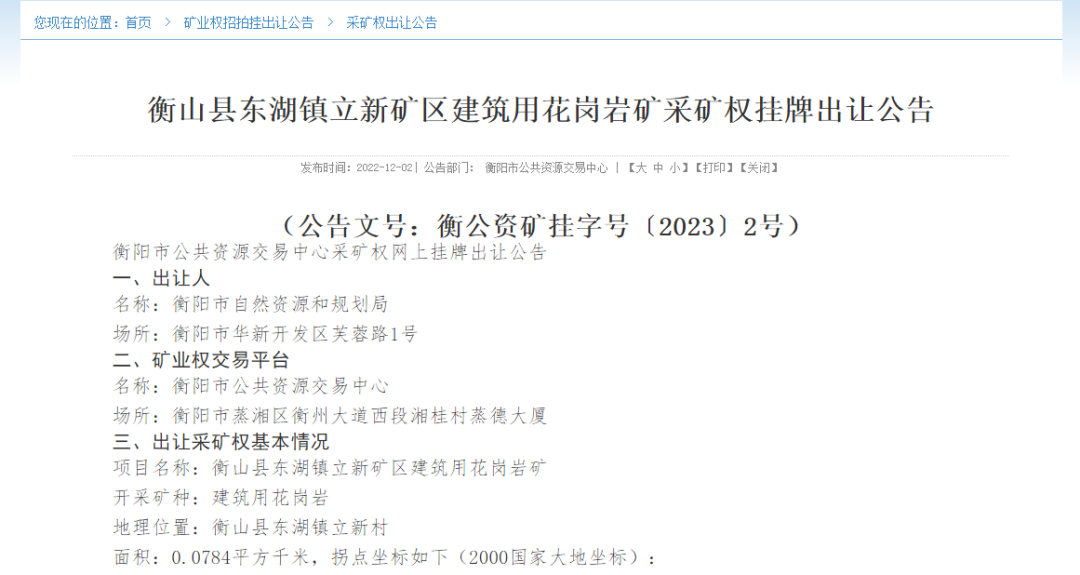 衡陽市公共資源交易中心采礦權(quán)發(fā)布2宗砂石礦采礦權(quán),分別為:衡山縣東湖鎮(zhèn)立新礦區(qū)建筑用花崗巖礦采礦權(quán),衡山縣開云鎮(zhèn)建勝礦區(qū)建筑用花崗巖礦。