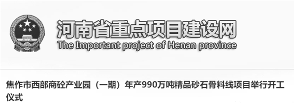 12月2日,河南焦作市西部商砼產(chǎn)業(yè)園(一期)年產(chǎn)990萬(wàn)噸精品砂石骨料生產(chǎn)線項(xiàng)目正式開工,焦作副市長(zhǎng)宗家楨出席了開工儀式。據(jù)了解,該項(xiàng)目分兩期建設(shè),總投資26億元,年產(chǎn)能990萬(wàn)噸。