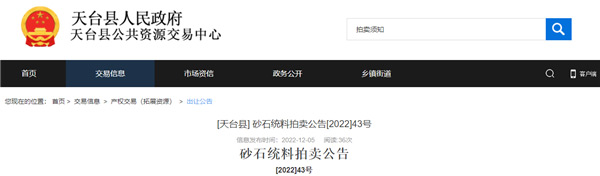日前,浙江臺州天臺縣公共資源交易中心發(fā)布一則砂石統(tǒng)料交易公告。
