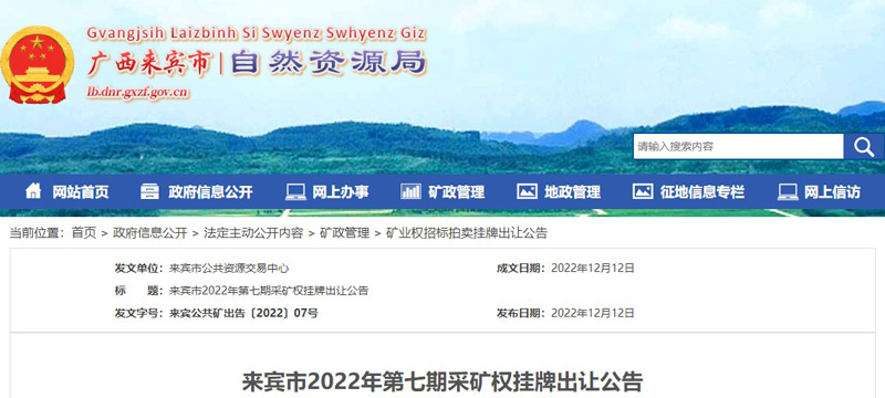 日前,廣西來賓市掛牌出讓一建筑石料用灰?guī)r礦,該礦區(qū)面積0.654平方公里,資源儲量12409.76萬噸(約1.24億噸),年生產(chǎn)規(guī)模500萬噸,出讓年限24年,起始價17530萬元(約1.75億元)。本次采礦權(quán)為擴大礦區(qū)范圍重新掛牌出讓,出讓方式為“凈礦”出讓,競買人需支付原礦區(qū)范圍內(nèi)的固定資產(chǎn)及長期待攤費用約3億元。掛牌時間2023年1月10日至2023年1月31日。