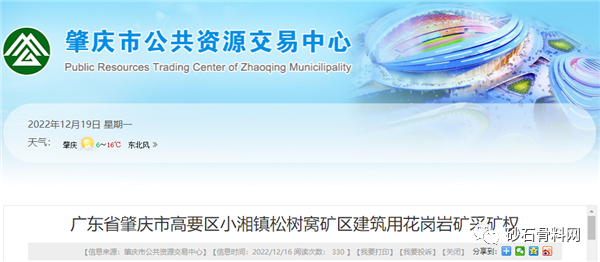 12月16日,肇慶市公共資源交易中心掛牌出讓廣東省肇慶市高要區(qū)小湘鎮(zhèn)松樹(shù)窩礦區(qū)建筑用花崗巖礦采礦權(quán),該礦區(qū)面積為1.288平方千米,資源儲(chǔ)量16108.8萬(wàn)方(約1.61億方),年生產(chǎn)規(guī)模800萬(wàn)方,出讓年限21年(含基建期2年,閉坑治理期1年),起始價(jià)20.1億元。掛牌時(shí)間2023年1月14日至2023年2月1日,不接受聯(lián)合競(jìng)買。