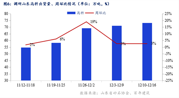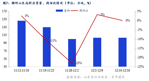12月16日,調研山東砂石生產企業(yè)28家,出貨量共176.5萬噸,較上周增加2萬噸,其中碎石占53%,機制砂占39%,石粉占8%。部分重點項目趕工期,加速砂石出貨回升。預計下周砂石出貨量持平。