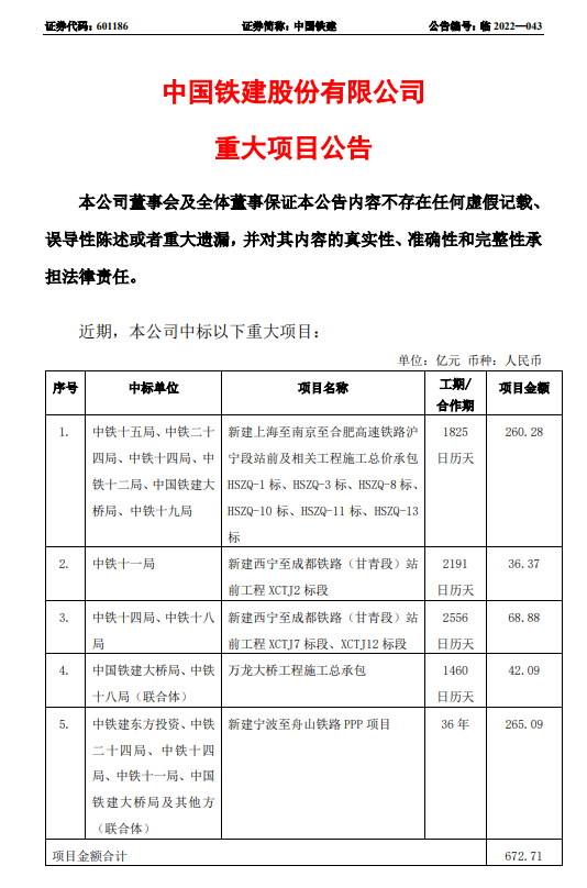 中國(guó)鐵建發(fā)布重大項(xiàng)目公告稱,已中標(biāo)合計(jì)672億重大項(xiàng)
