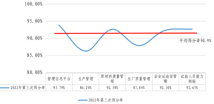 2022年第三次評(píng)估現(xiàn)場(chǎng)檢查平均得分為90.66分,較2022年第二次評(píng)估提高0.22分。無(wú)95分以上的企業(yè);95分~90分(含)之間的企業(yè)有71家,占總數(shù)的74.74%;90分~85分(含)之間的企業(yè)有19家,占總數(shù)的20.00%;85分~80分(含)之間的企業(yè)有4家,占總數(shù)的4.21%;80分以下企業(yè)有1家,占總數(shù)的1.05%。