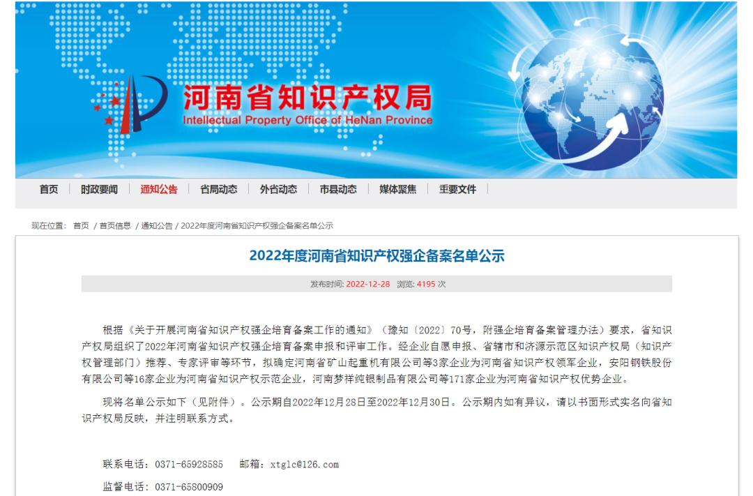近日,河南省知識(shí)產(chǎn)權(quán)局公示了“2022年度河南省知識(shí)產(chǎn)權(quán)強(qiáng)企備案名單”。河南中譽(yù)鼎力智能裝備有限公司憑借先進(jìn)的技術(shù)研發(fā)創(chuàng)新和知識(shí)產(chǎn)權(quán)管理實(shí)力,成功入選“2022年度河南省知識(shí)產(chǎn)權(quán)優(yōu)勢(shì)企業(yè)”!